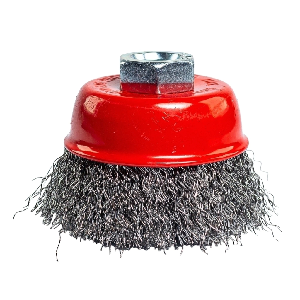 - Escova circular, tipo copo, com tufos de filamentos de aço.
