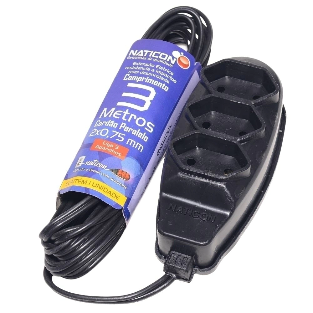Extensão de 3m 2 x 0,75mm com 3 Tomadas de 2 Pinos Naticon