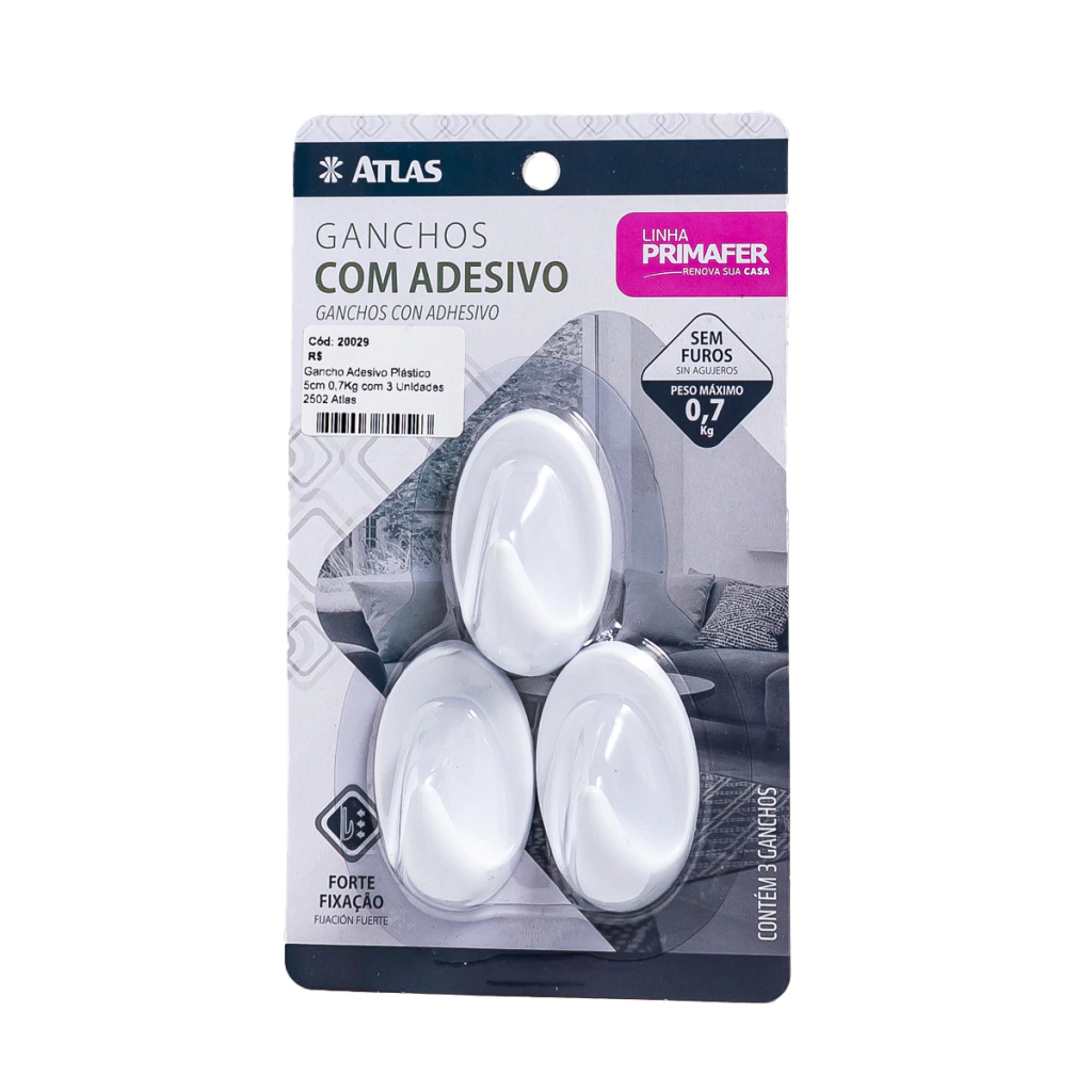 Gancho Adesivo Plástico 5cm 0,7Kg com 3 Unidades 2502 Atlas