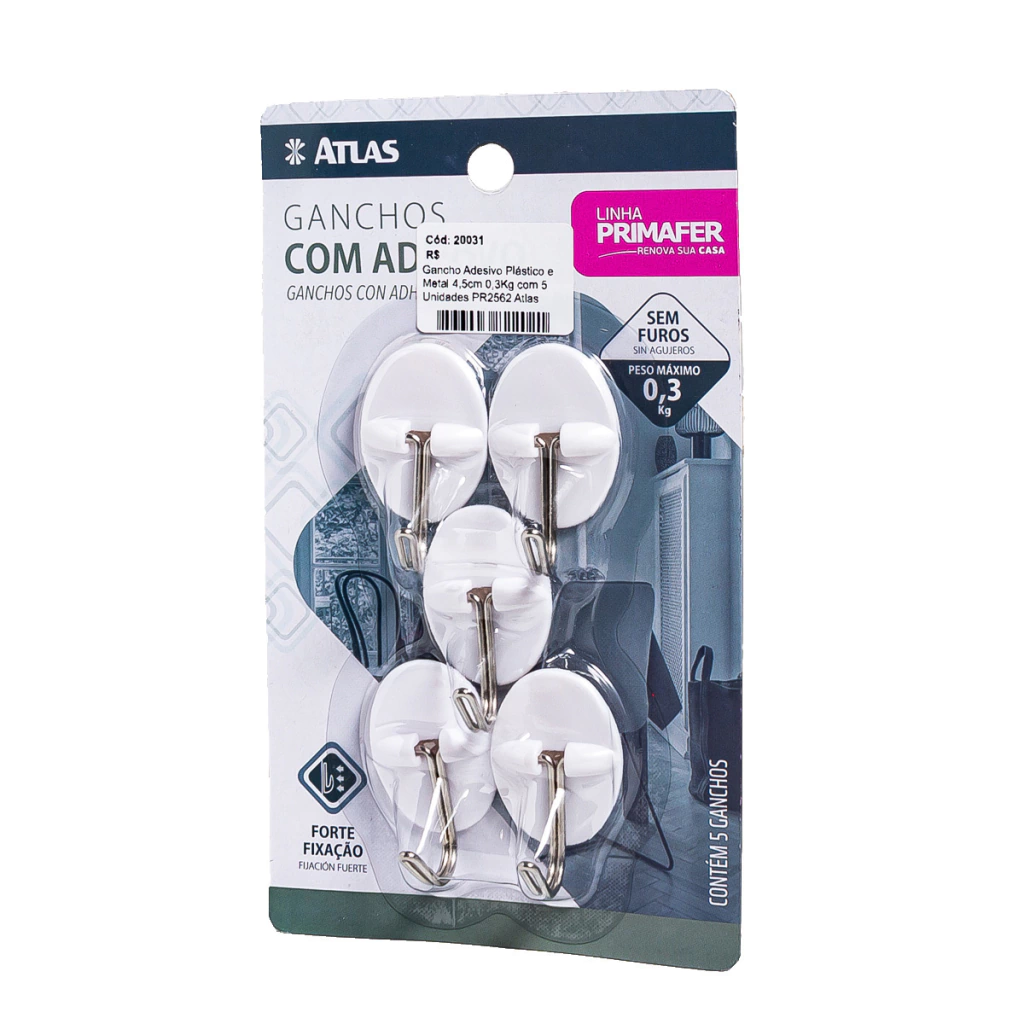 Gancho Adesivo Plástico e Metal 4,5cm 0,3Kg com 5 Unidades PR2562 Atlas