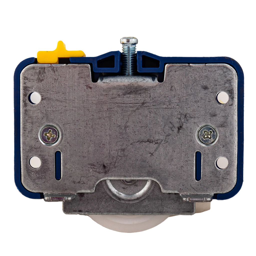 - Conta com inovador e exclusivo sistema de mola confinada, o que impede totalmente a mola de escapar da estrutura ou sair do seu eixo. Localizada na blindagem da estrutura da roldana, permite a ação do seu sistema antidescarrilhamento corrigindo imperfeições do trilho.