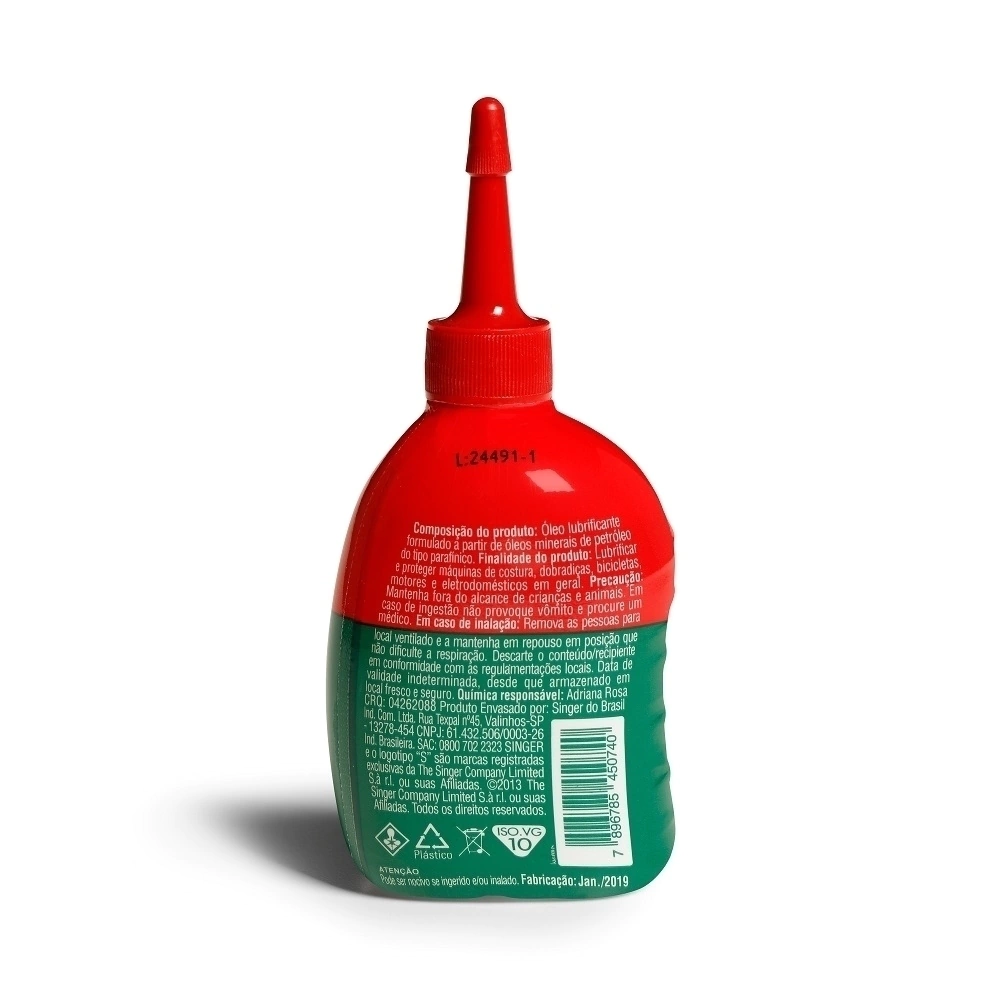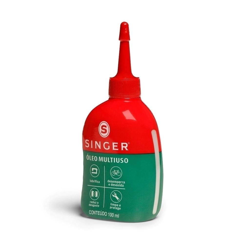 - O óleo Singer 100mL lubrificante multiuso é um composto finíssimo de óleos selecionados que garante maior ação penetrante, lubrificação e conservação mais duradouras. - Seu uso freqüente evita desgastes em todos os aparelhos domésticos, bicicletas, máquinas de costura, ciclomotores, automóveis, trincos, dobradiças, engrenagens, entre outros.