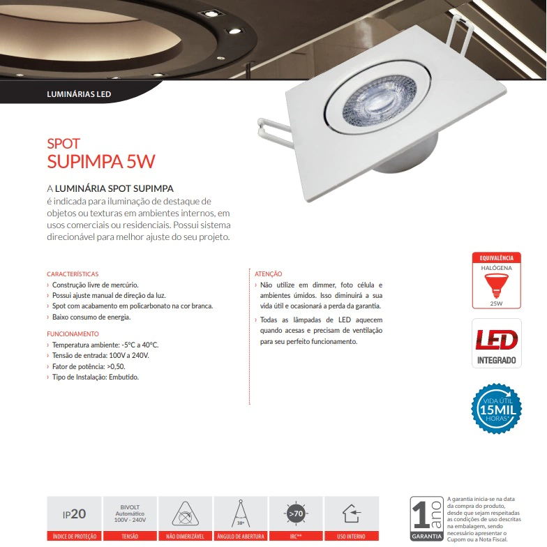 Possui emissão de luz focal com instalação do tipo embutida em forro de gesso.
